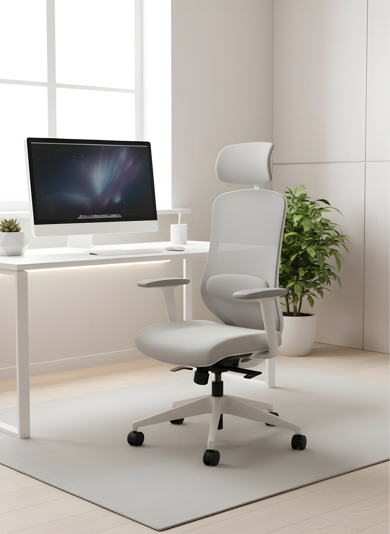 La Silla Ergonómica Aurora en color gris claro combina diseño moderno y confort absoluto. Su respaldo en mesh transpirable con soporte lumbar ajustable, asiento ergonómico de poliuretano inyectado y cabecera 3D garantizan comodidad durante largas jornadas. Equipada con brazos 3D, mecanismo inteligente con 3 posiciones de bloqueo, slider y sistema antishock, ofrece máxima adaptabilidad. Resistente y funcional, soporta hasta 136 kg, ideal para oficina o home office.